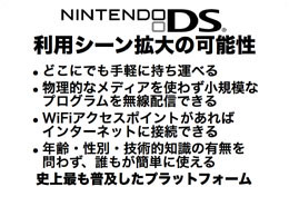 DSはどこにでも手軽に持ち運べて、物理的なメディアを使わなくても小規模なプログラムを無線配信ができて、Wi-Fiのアクセスポイントさえあればインターネットに接続することができ、そして年齢・性別・技術的知識の有無を問わず説明書を読まなくても誰もが簡単に使えるとう特徴を持った史上最も普及したプラットフォームであると考えています。携帯電話の普及台数はDSの普及台数よりはるかに多いですが、多くの機種があるために、事実上1つのプラットフォームとは言えない状況になっています。ゲーム機であるDSは、1つのプラットフォームとして共通のプログラムが普及台数全てで使えることになるところに大きな特徴があります。