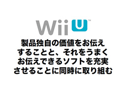 ただし、現状ではまだ製品価値をしっかりとお伝えできていないことがはっきりしましたので、ソフトが充実する前に、そのことにしっかりと取り組むと同時に、Wii Uの価値をうまく伝えられるソフトを充実させることにも同時に取り組んでいきます。