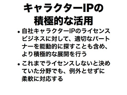 より具体的には、自社キャラクターIPのライセンスビジネスに対して、適切なパートナーを能動的に探すことも含め、より積極的な展開を行うということです。実際に、アメリカでは、キャラクターマーチャンダイズの商品展開を、1年ほど前から積極的に展開しています。