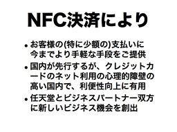 昨年のこの場で、日本で最も普及が進んでいる交通系電子マネーであるJR東日本様のSuicaを用いて、Wii U GamePadに搭載されているNFC機能を利用した決済が実現できるように、検討を進めているということを申し上げていました。