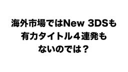 一方で、海外市場に目を向けますと、今年Newニンテンドー3DSの発売は、アメリカでもヨーロッパでも予定していませんし、『スマブラ』と『ポケモン』は発売されても、『妖怪ウォッチ』や『モンスターハンター4G』はまだ発売されていませんから、有力タイトル4連発ということもありませんので、「国内市場はともかく、海外市場で3DSの普及の勢いを加速できるのか」という疑問をお持ちの方もいらっしゃると思います。