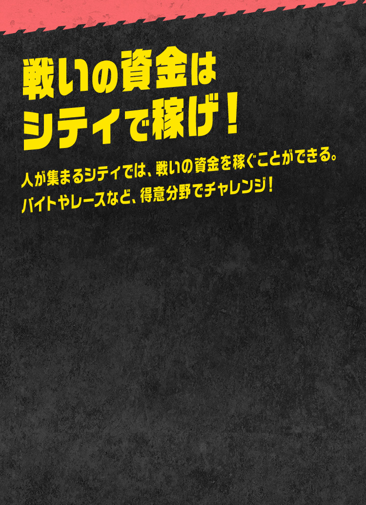 戦いの資金はシティで稼げ!人が集まるシティでは、戦いの資金を稼ぐことができる。バイトやレースなど、得意分野でチャレンジ!