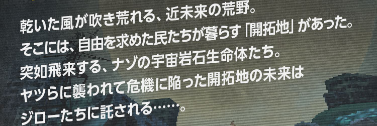 乾いた⾵が吹き荒れる、近未来の荒野。そこには、⾃由を求めた⺠たちが暮らす「開拓地」があった。突如⾶来する、ナゾの宇宙岩⽯生命体たち。ヤツらに襲われて危機に陥った開拓地の未来はジローたちに託される……。