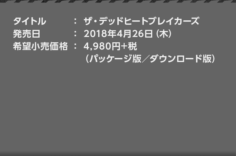 タイトル:ザ・デッドヒートブレイカーズ 発売日:2018年4月26日(木) 希望小売価格:4,980円+税(パッケージ版/ダウンロード版)