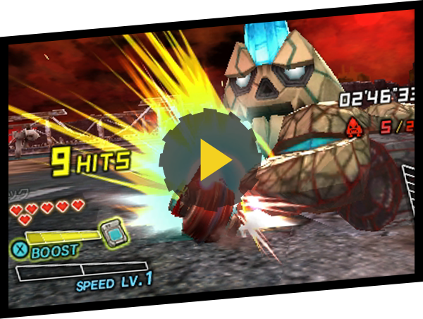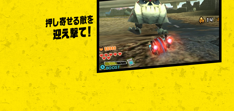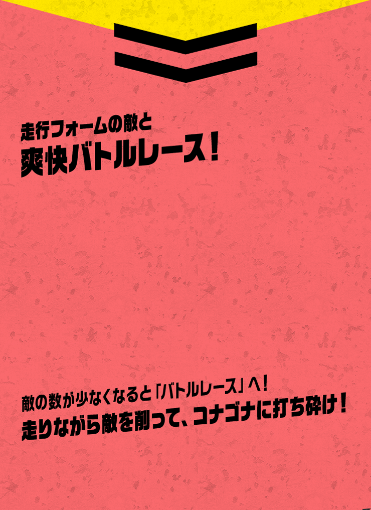 走行フォームの敵と爽快バトルレース! 敵の数が少なくなると「バトルレース」へ!走りながら敵を削って、コナゴナに打ち砕け!