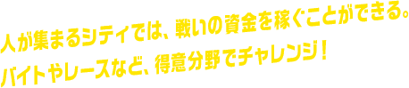 人が集まるシティでは、戦いの資金を稼ぐことができる。バイトやレースなど、得意分野でチャレンジ!