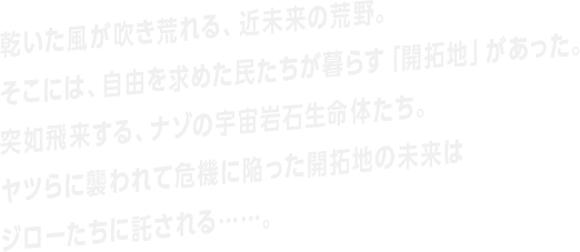 乾いた⾵が吹き荒れる、近未来の荒野。そこには、⾃由を求めた⺠たちが暮らす「開拓地」があった。突如⾶来する、ナゾの宇宙岩⽯生命体たち。ヤツらに襲われて危機に陥った開拓地の未来はジローたちに託される……。