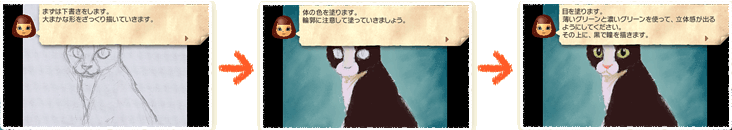 友達と描き方を教えあうことができます。絵を描く過程の各ステップごとに説明文をつけて、オリジナルの「手作りレッスン」が作れます。ぜひいろいろな手作りレッスンを作って、友達に送り、描いてみてもらってください。