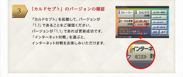 3 『カルドセプト』のバージョンの確認 『カルドセプト』を起動して、バージョンが「1.1」であることをご確認ください。バージョンが「1.1」であれば更新成功です。「インターネット対戦」を選ぶと、インターネット対戦をお楽しみいただけます。