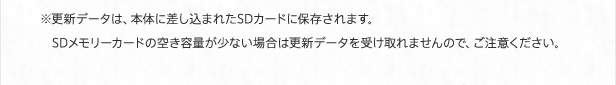 ※更新データは、本体に差し込まれたSDカードに保存されます。SDメモリーカードの空き容量が少ない場合は更新データを受け取れませんので、ご注意ください(更新データのブロック数は19ブロックです)。