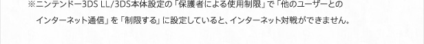※ニンテンドー3DS LL/3DS本体設定の「保護者による使用制限」で「他のユーザーとのインターネット通信」を「制限する」に設定していると、インターネット対戦ができません。