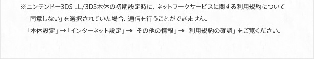 ※ニンテンドー3DS LL/3DS本体の初期設定時に、ネットワークサービスに関する利用規約について 「同意しない」を選択されていた場合、通信を行うことができません。「本体設定」→「インターネット設定」→「その他の情報」→「利用規約の確認」をご覧ください。
