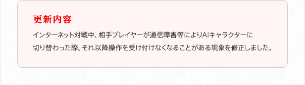 更新内容 インターネット対戦中、相手プレイヤーが通信障害等によりAIキャラクターに切り替わった際、それ以降操作を受け付けなくなることがある現象を修正しました。