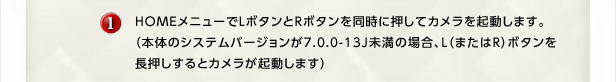 HHOMEメニューでLボタンとRボタンを同時に押してカメラを起動します。(本体のシステムバージョンが7.0.0-13J未満の場合、L(またはR)ボタンを長押しするとカメラが起動します)