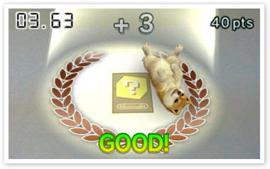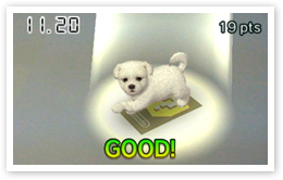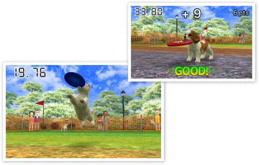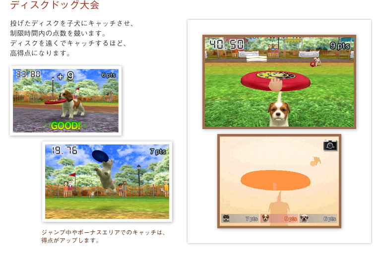 投げたディスクを子犬にキャッチさせ、制限時間内の点数を競います。ディスクを遠くでキャッチするほど、高得点になります。