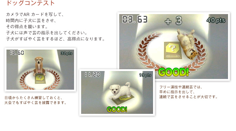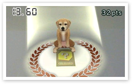 カメラでAR カードを写して、時間内に子犬に芸をさせ、その得点を競います。子犬には声で芸の指示を出してください。子犬がすばやく芸をするほど、高得点になります。