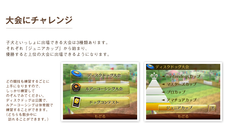 子犬といっしょに出場できる大会は3種類あります。それぞれ「ジュニアカップ」から始まり、優勝すると上位の大会に出場できるようになります。