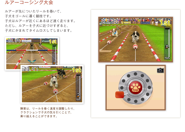 ルアーが先についたリールを巻いて、子犬をゴールに導く競技です。子犬はルアーが近くにあるほど速く走ります。ただし、ルアーを子犬に近づけすぎると、子犬にかまれてタイムロスしてしまいます。