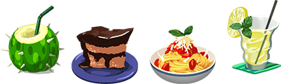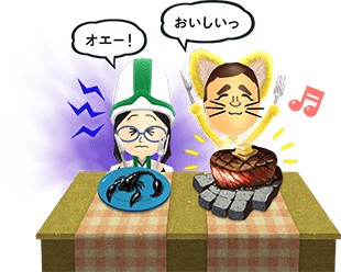 Miiに料理を食べさせると、HPやMP、「こうげき」や「しゅび」などの能力がアップします。料理は、怪物たちにちなんだファンタジックなもの!戦いに勝利すると手に入ります。