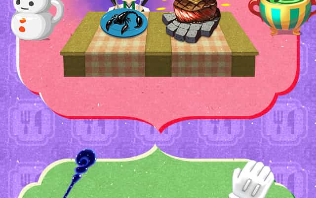 Miiに料理を食べさせると、HPやMP、「こうげき」や「しゅび」などの能力がアップします。料理は、怪物たちにちなんだファンタジックなもの!戦いに勝利すると手に入ります。