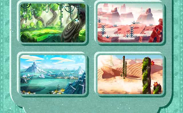 あなたとなかまのMiiが冒険する世界、ミートピア。緑豊かな森、険しい山々、どこまでも広がる平原、カラカラの砂漠……表情豊かで美しい風景の中をゴキゲンなBGMとともに旅していきます。