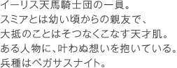 イーリス天馬騎士団の一員。スミアとは幼い頃からの親友で、大抵のことはそつなくこなす天才肌。ある人物に、叶わぬ想いを抱いている。兵種はペガサスナイト。