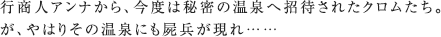 行商人アンナから、今度は秘密の温泉へ招待されたクロムたち。が、やはりその温泉にも屍兵が現れ……