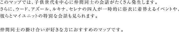 このマップでは、子供世代を中心に仲間同士の会話がたくさん発生します。さらに、ウード、アズール、ルキナ、セレナの四人が一時的に浴衣に着替えるイベントや、彼らとマイユニットの特別な会話も見られます。仲間同士の掛け合いが好きな方におすすめのマップです。