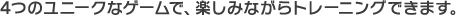 4つのユニークなゲームで、楽しみながらトレーニングできます。