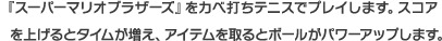 『スーパーマリオブラザーズ』をカベ打ちテニスでプレイします。スコアを上げるとタイムが増え、アイテムを取るとボールがパワーアップします。