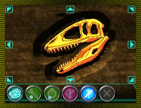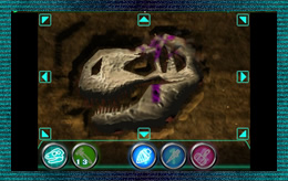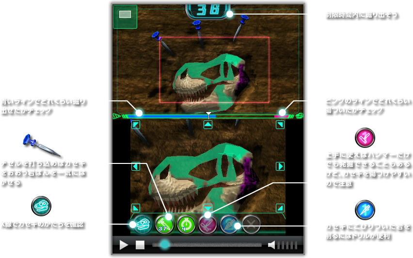 X線で岩に埋まったカセキの形を確認。ハンマーやドリルでカセキを発掘します。傷をつけないようにカセキを発掘すればするほど、恐竜はより強く蘇ります。