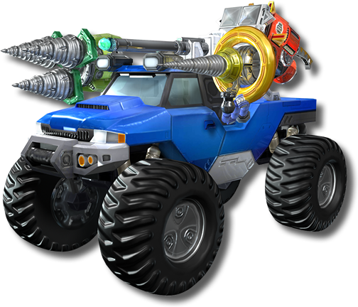 カセキモービルの装備。とくしゅな弾(たま)を、味方リバイバーに撃ち込むことで、攻撃力や防御力を、一時的にパワーアップします。「いじょうかいふく」や「スピードアップ」などさまざまな種類があり、バトルのサポートをすることができます。