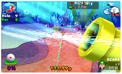 海底でラウンドするコース。 土管から流れる水流が行く手をはばみます。