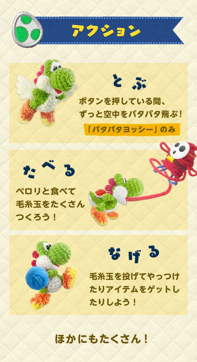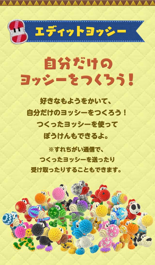 ヨッシーのamiiboを使うと…ヨッシーがもうひとり!?1人で2人分のヨッシーを同時に動かせる「ダブルヨッシー」※助けたヨッシーをあみぐるみヨッシーのamiiboに書き込むと、書き込んだヨッシーをダブルヨッシーとして呼び出すこともできます。 「あみぐるみヨッシー」amiiboについてくわしく
