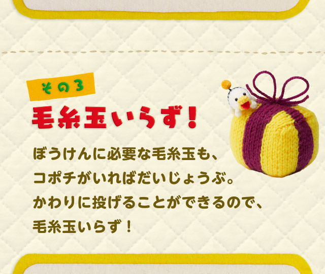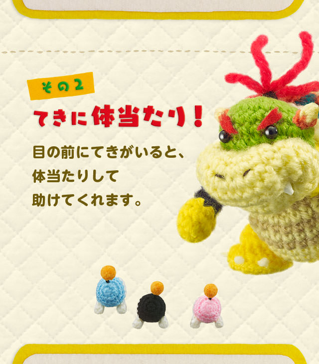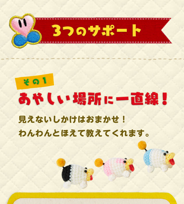 はじめてでも安心コポチのサポート 3びきの「コポチ」がヨッシーのぼうけんを助けます。あやしい場所も、手ごわいてきも、全部おまかせ!