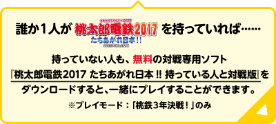 •  1台の3DSと1本の「桃太郎電鉄2017 たちあがれ日本!!」で3DS本体をわたしあって交代でプレイできます。