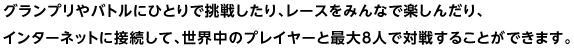 グランプリやバトルにひとりで挑戦したり、レースをみんなで楽しんだり、インターネットに接続して、世界中のプレイヤーと最大8人で対戦することができます。