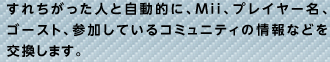 すれちがった人と自動的に、Mii、プレイヤー名、ゴースト、参加しているコミュニティの情報などを交換します。