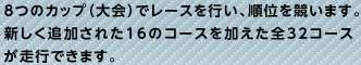 8つのカップ(大会)でレースを行い、順位を競います。新しく追加された16のコースを加えた全32コースが走行できます。