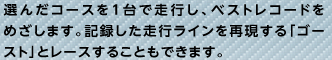 選んだコースを1台で走行し、ベストレコードをめざします。記録した走行ラインを再現する「ゴースト」とレースすることもできます。