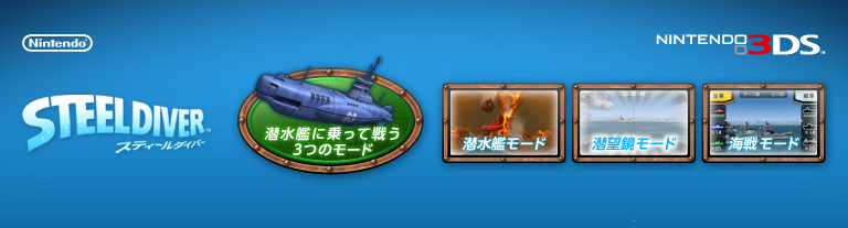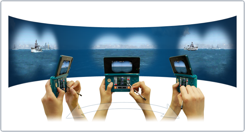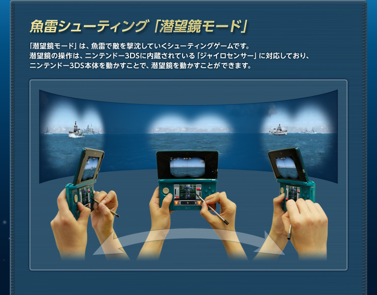「潜望鏡モード」は、魚雷で敵を撃沈していくシューティングゲームです。潜望鏡の操作は、ニンテンドー3DSに内蔵されている「ジャイロセンサー」に対応しており、ニンテンドー3DS本体を動かすことで、潜望鏡を動かすことができます。