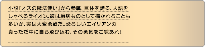 ライオン Strike Team Eliminating the Alien Menace 小説『オズの魔法使い』から参戦。巨体を誇る、人語をしゃべるライオン。彼は臆病ものとして描かれることも多いが、実は大変勇敢だ。恐ろしいエイリアンの真っただ中に自ら飛び込む、その勇気をご覧あれ!