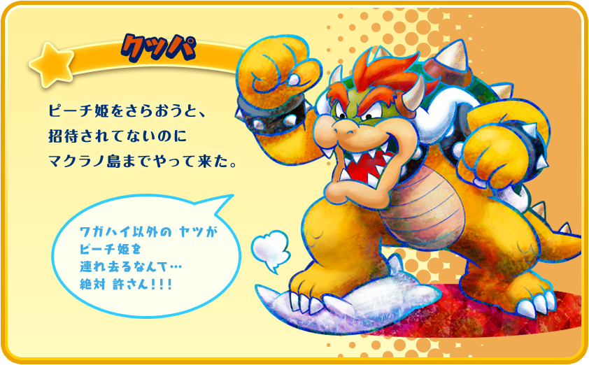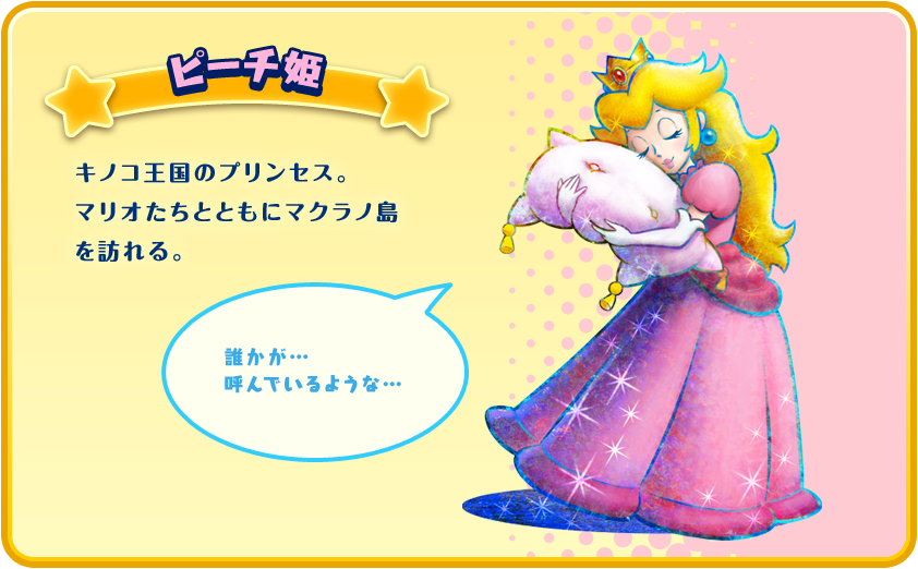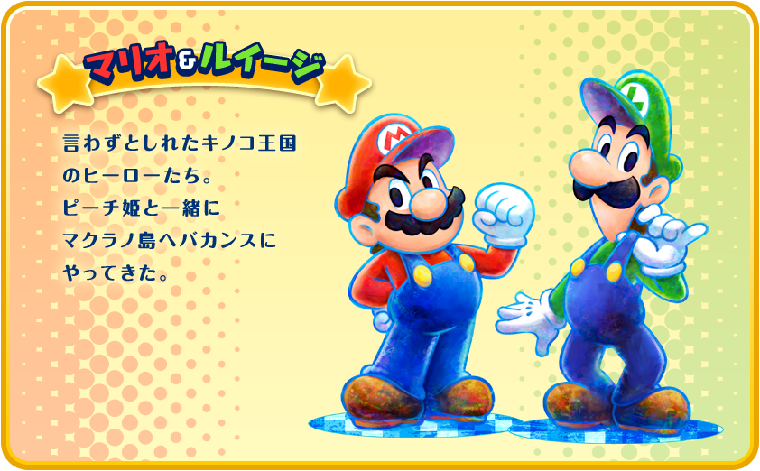 • ある日のこと、キノコ王国のピーチ城に一通の手紙が届けられました。それは「マクラノ島(とう)」と呼ばれる、島のオーナーからのバカンスの招待状。招待を受けたマリオたち一行は、この島に向かうことにしました。