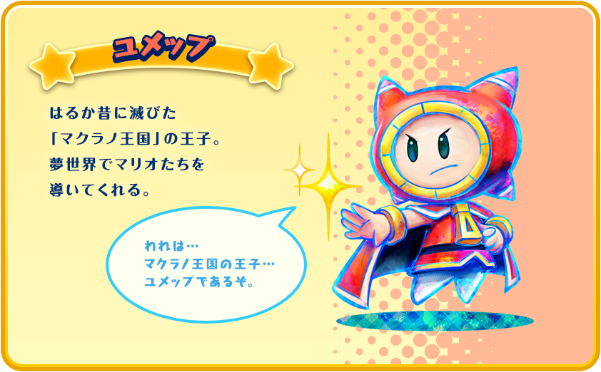• マクラはこの島の先住民族「マクラノ族」が、コウモリの魔王アックームにばらまかれた悪夢のカケラのせいで固まってしまった仮の姿。マリオは“もとの世界”とルイージの“夢世界”を行き来して、マクラノ族を開放しながらピーチ姫の行方を追います。果たしてマリオたちは、無事にピーチ姫を助け出すことができるのでしょうか。