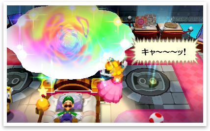 • マクラノ島に到着した一行が観光をしていると、ピーチ姫が何者かによって、夢の世界へと引きずり込まれてしまいます。その夢世界へ入るための扉は、ルイージが不思議な力を持ったマクラで眠ると出現することが分かります。