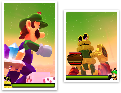• ハンマー タッチペンを指示の方向に素早くスライドすると、ルイージがハンマーをふります。敵をたたいたり、敵の攻撃を弾き返したりできます。