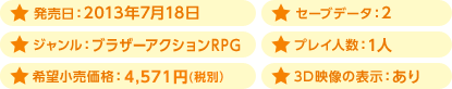 発売日:2013年7月18日 セーブデータ:2 ジャンル:ブラザーアクションRPG プレイ人数:1人 希望小売価格:4,571円(税別) 3D映像の表示:あり