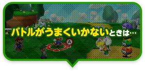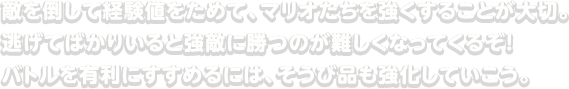 敵を倒して経験値をためて、マリオたちを強くすることが大切。逃げてばかりいると強敵に勝つのが難しくなってくるぞ!バトルを有利にすすめるには、そうび品も強化していこう。