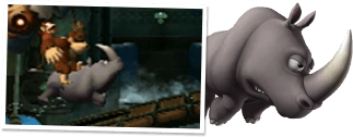 ドンキーコングたちの心強い味方、サイの“ランビ”。背中にドンキーコングたちを乗せて、障害物や敵をものともせずに突き進みます。