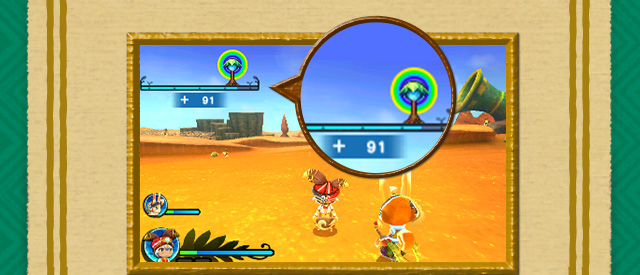 それぞれの”ハナミセ”は、必要な素材を納品すると、在庫数が増え、お店のランクやオアシスの“虹の加護”と呼ばれるゲージが増えます。素材を集めるために、砂漠を探索したり、オアシスの栽培園で果実を収穫したりします。
